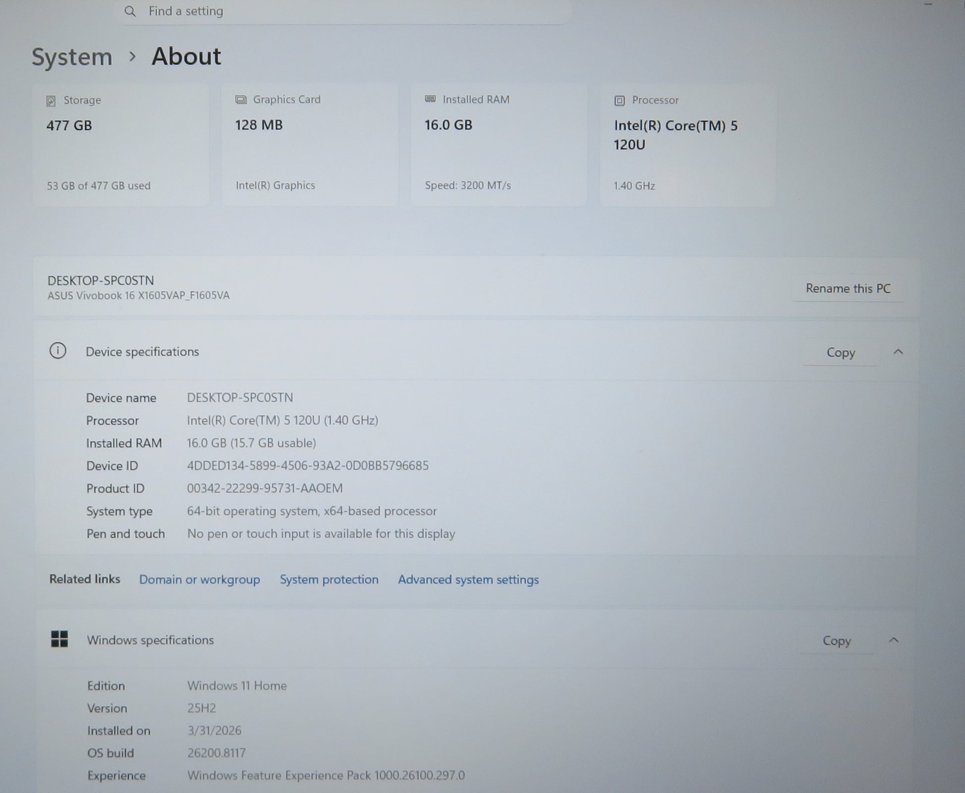 ASUS VIVOBOOK F1605V 16IN CORE 5 120U 1.4GHz 16GB RAM 512GB SSD WIN11 HOME