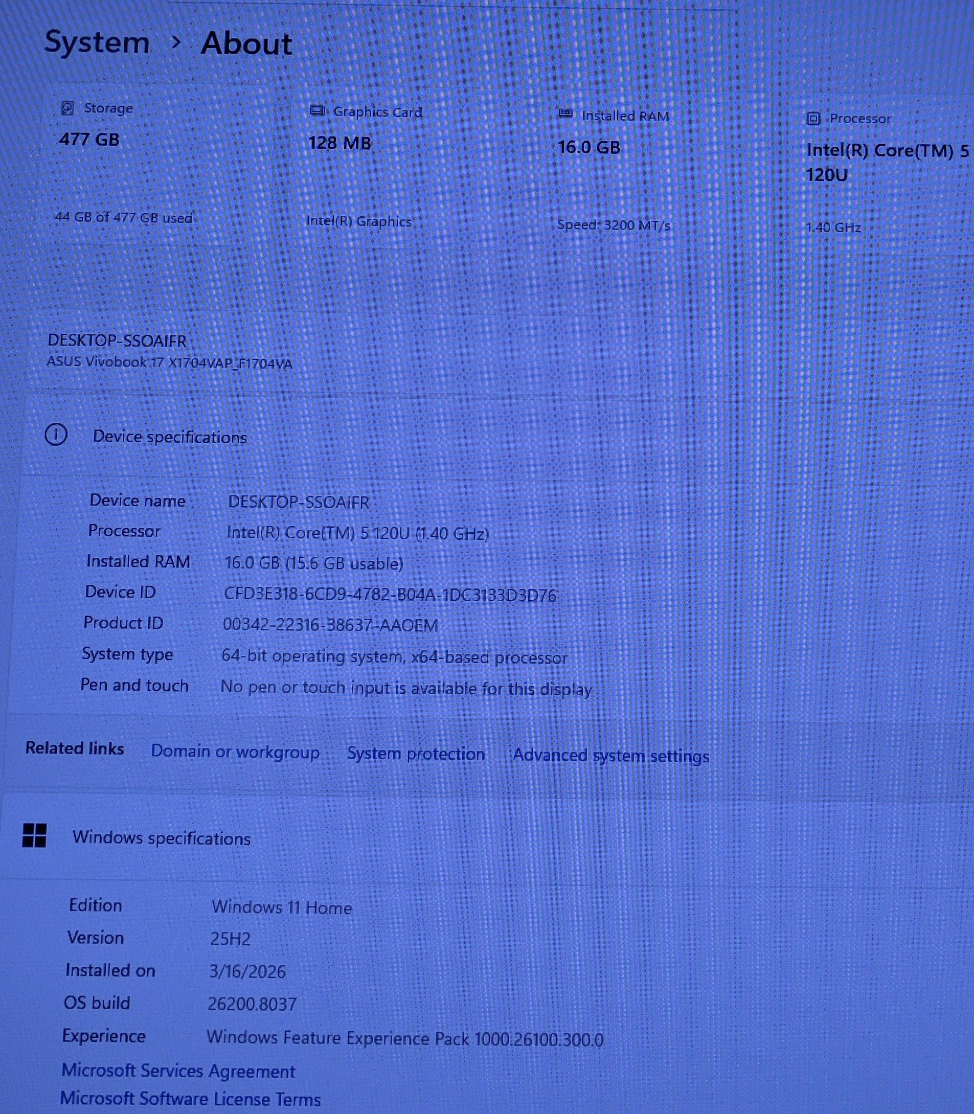 Asus Vivobook F1704V I5-120U 16GB RAM 512GB SSD