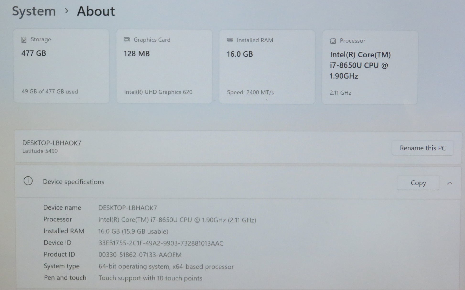 Dell Latitude 5490 14in Touchscreen i7 8650U 1.9GHz 16GB RAM 512GB Win 11