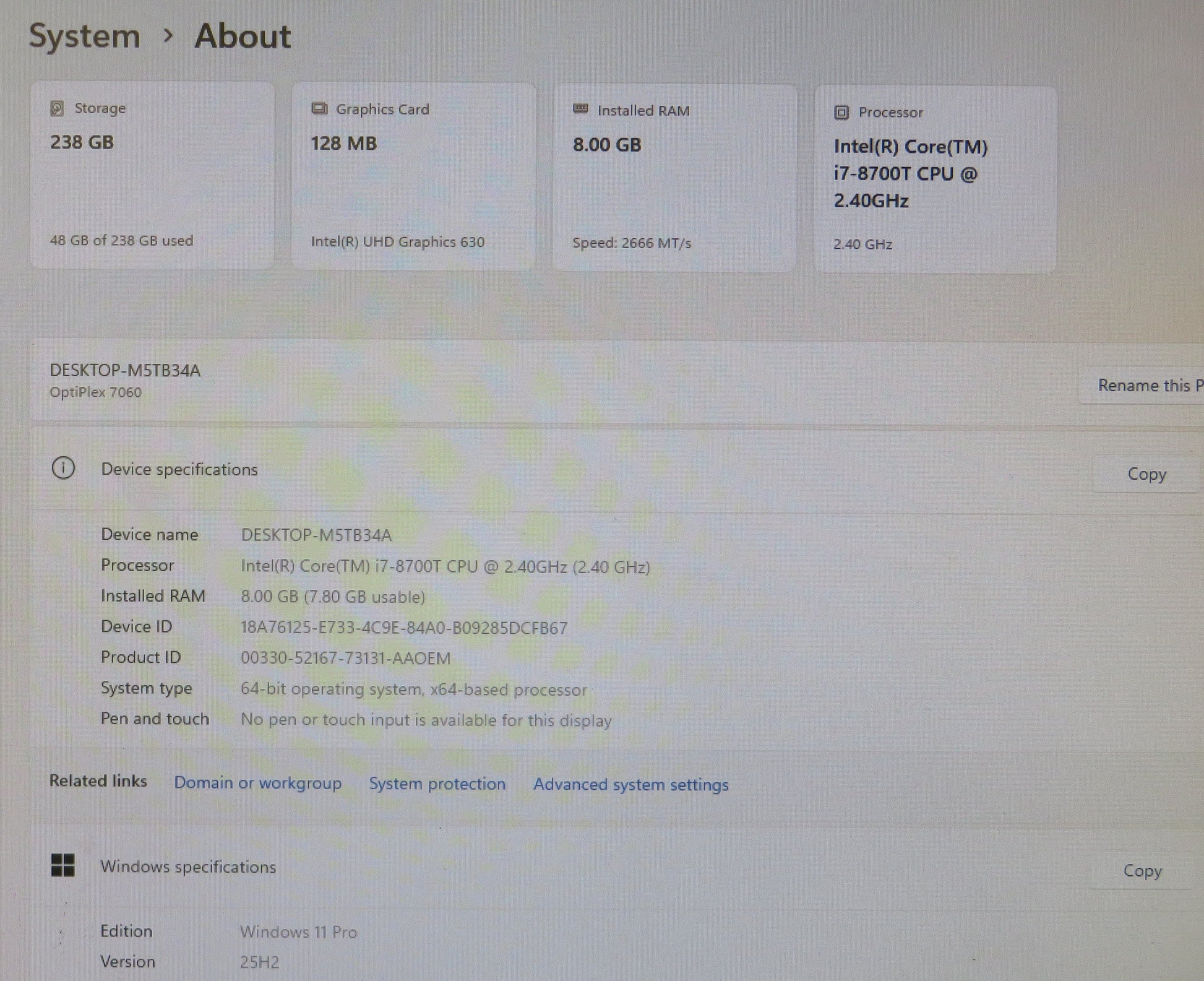 Dell Optiplex 7060 Micro Form Factor i7 8700T 2.4GHz 8GB RAM 256GB Win11 Pro