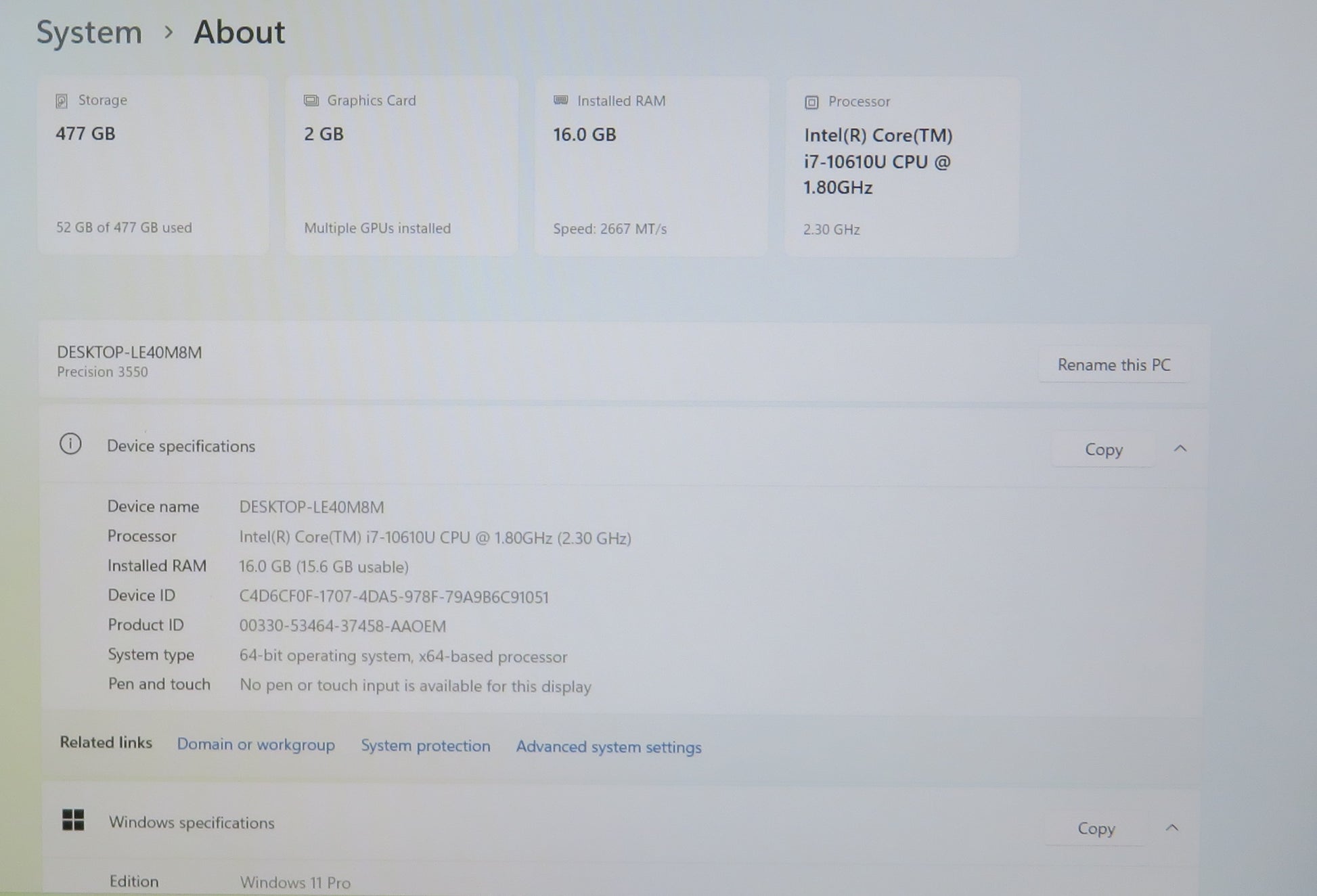 Dell Precision 3550 15in i7 10610U 1.8GHz 16GB RAM 512GB Win 11 Pro QUADRO P520